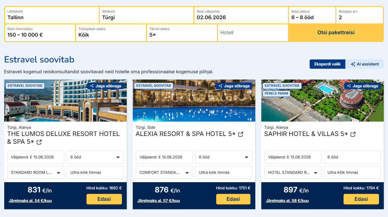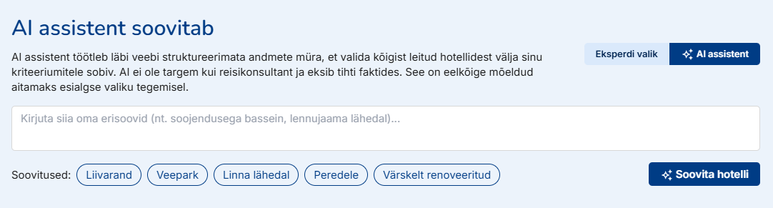 Oluline detail: vaikimisi jääb valituks endiselt “Estravel soovitab”. AI assistent on lisandväärtus neile, kes tahavad oma soove natuke täpsemalt kirjeldada ja saada selle põhjal nutikalt filtreeritud valikut. AI-l samas ei ole reisikonsultandi teadmisi ning see võib teha soovituste andmisel ka vigu.