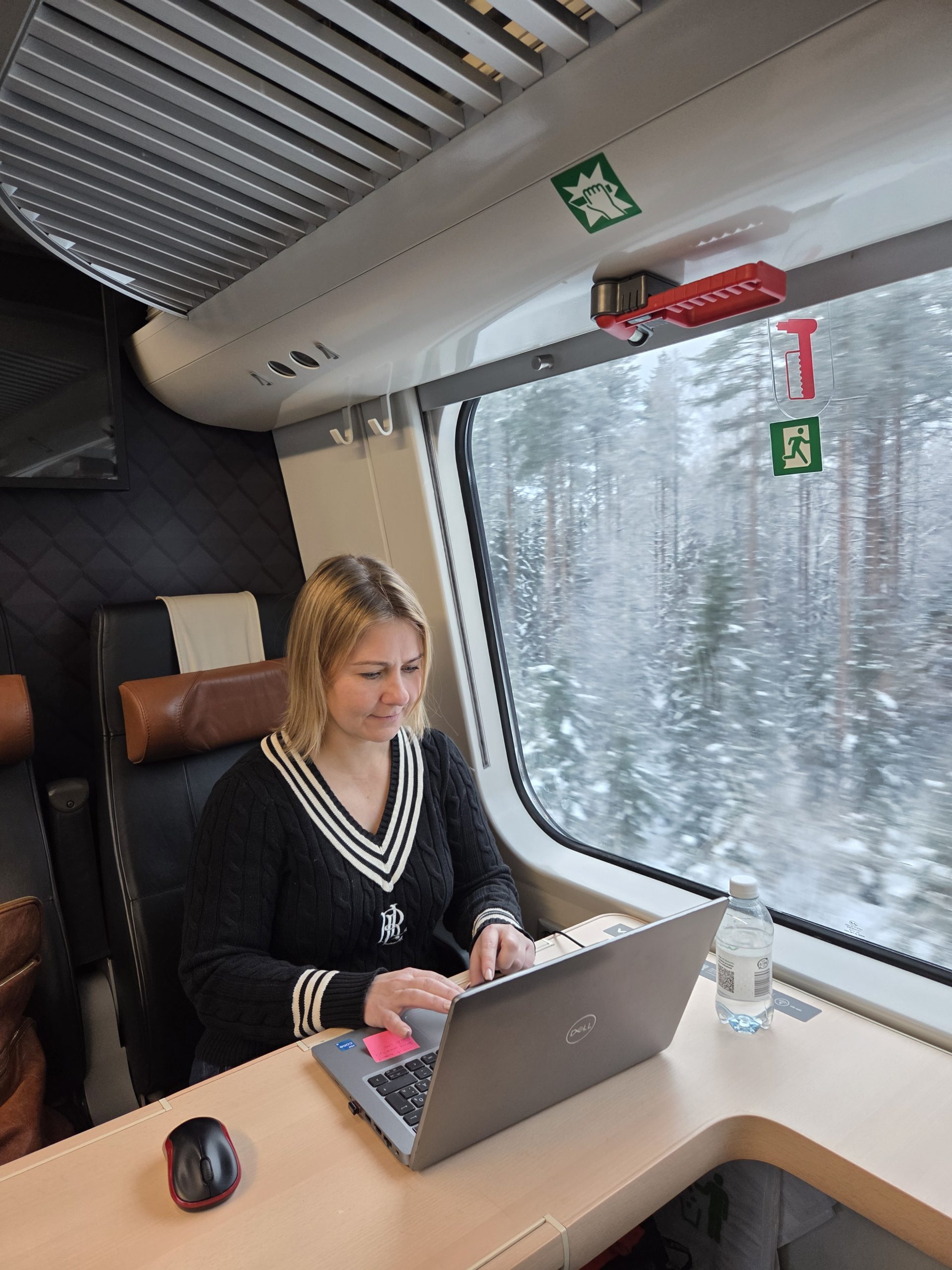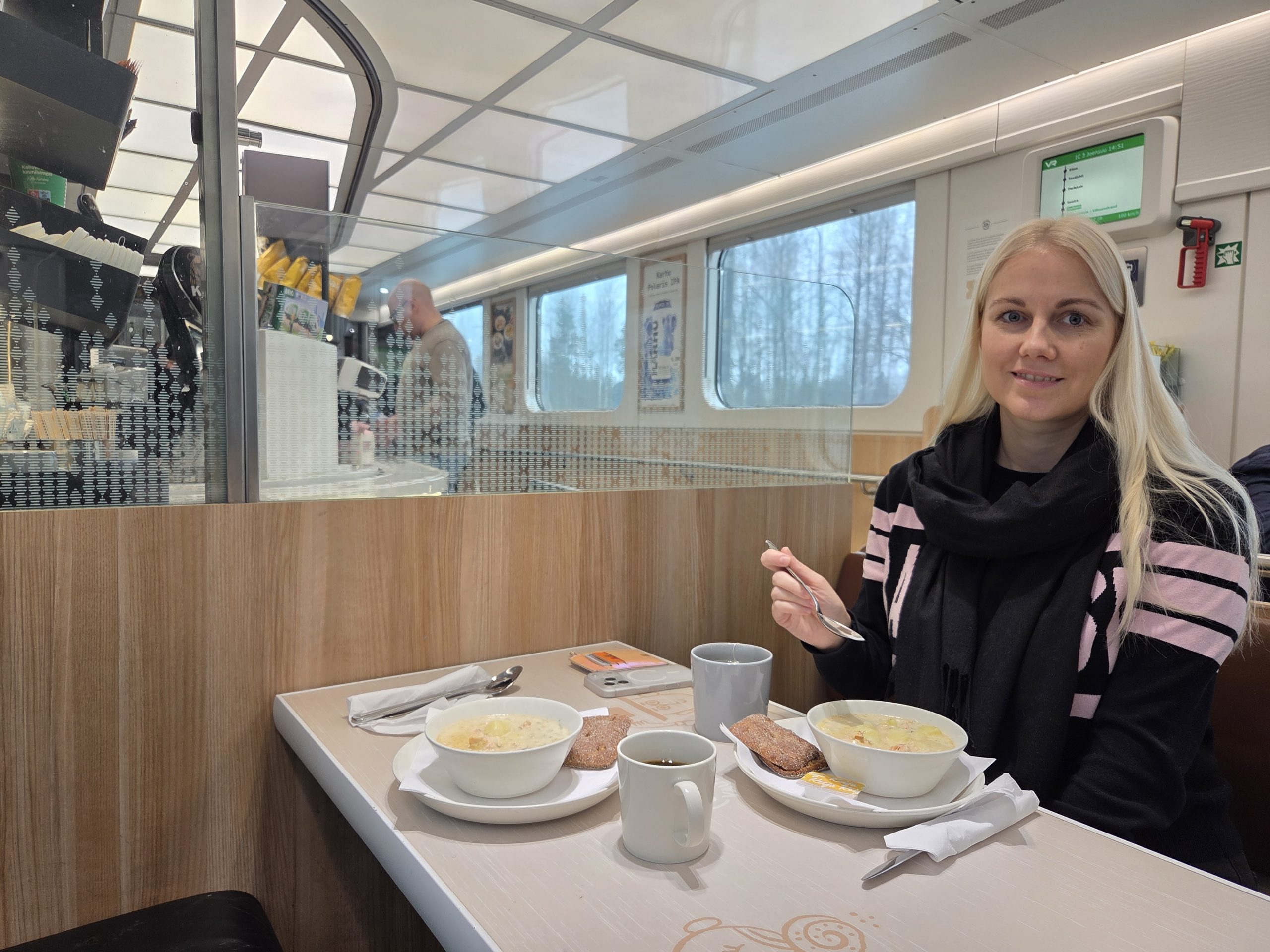 Teekond jätkus VR rongiga suunal Helsingi-Joensuu. Rongisõit Soomes on elamus omaette – see on rahulik, mugav ja võimaldab aega kasulikult kasutada. Reisisime kahekorruselise Inter City rongi Ekstra Relaxed klassis, kus ootasid suuremad istmevahed, tasuta vesi ja kuumad joogid. Toidud olid üllatavalt head – eriti lõhesupp.