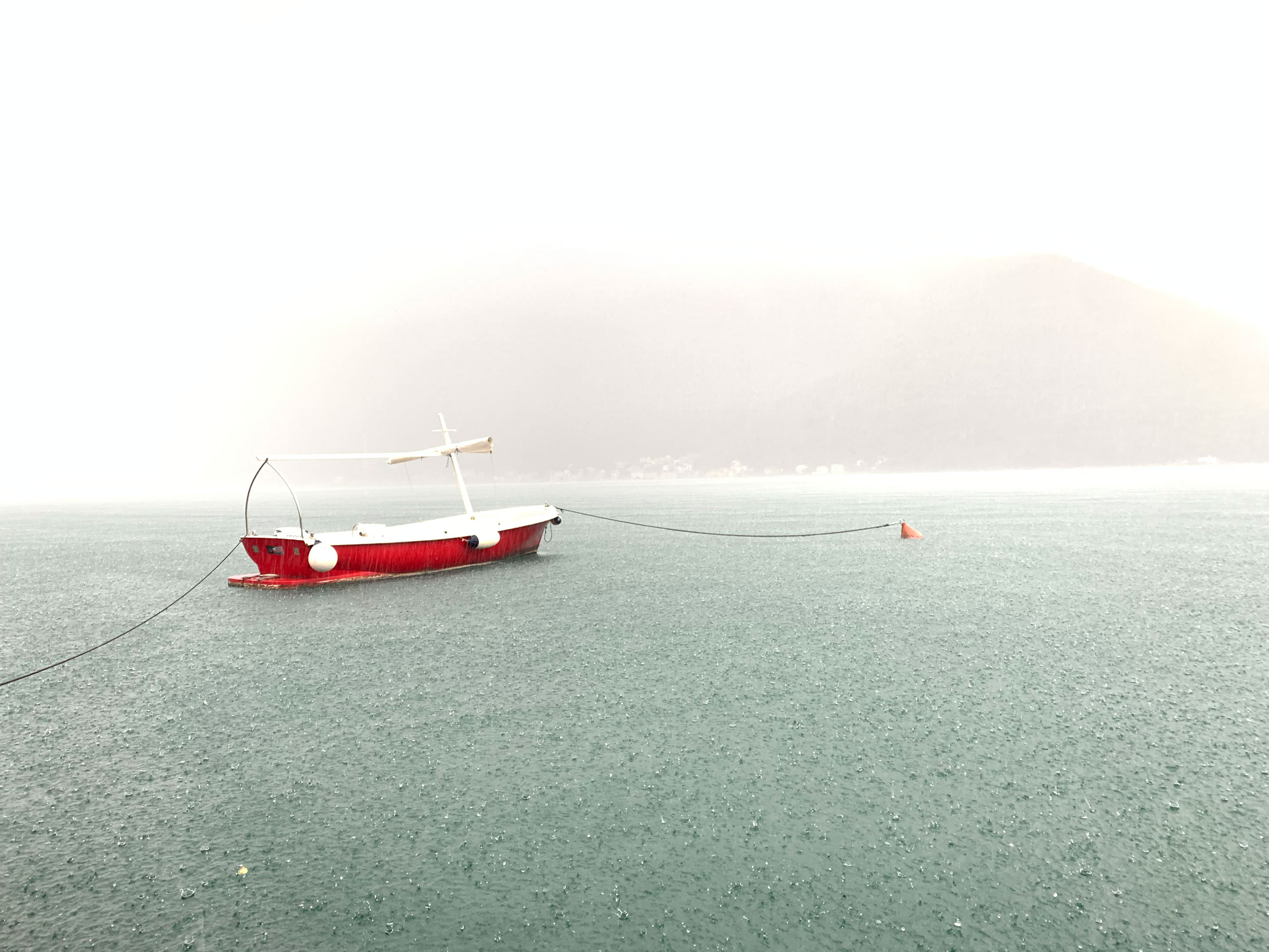 Tagasi linna jõudes istume lõunasöögiks rannaäärsesse söögikohta Conte. Rannikul on toit Vahemere köögi mõjutustega (mereannid, salatid jm). Saame nautida nii toitu kui ka paduvihma. Mäed kattuvad kiirelt uduga, taevas ja veepiir sulavad üheks, suured vihmapiisad hüplevad veepinnal – võimas ilu, sügise võlu! Tundub, et kõik need vähesed linna külastama tulnud turistid on varjunud sama restoranikatuse alla.