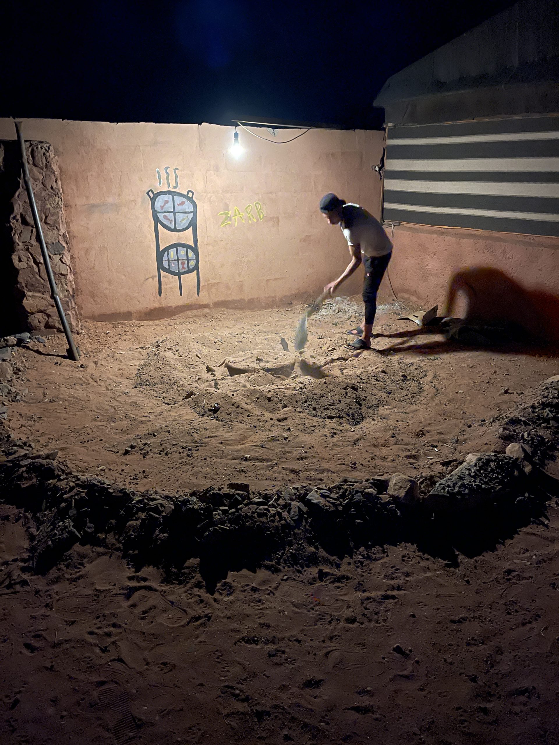 Söögid olid telklaagris väga lihtsad, ei tasu suurt gurmee-elamust oodata. Esile tuuakse lihtsust ehk elu, mida beduiinid alati elanud on. Mõistlik oleks seal peatudes mõned snäkid omale kaasa võtta. Enne õhtusööki (kana ja juurviljad) näidati meile, kuidas õhtusöök liiva seest välja kaevatakse ja selgitati, kuidas täpselt seda küpsetama peab: