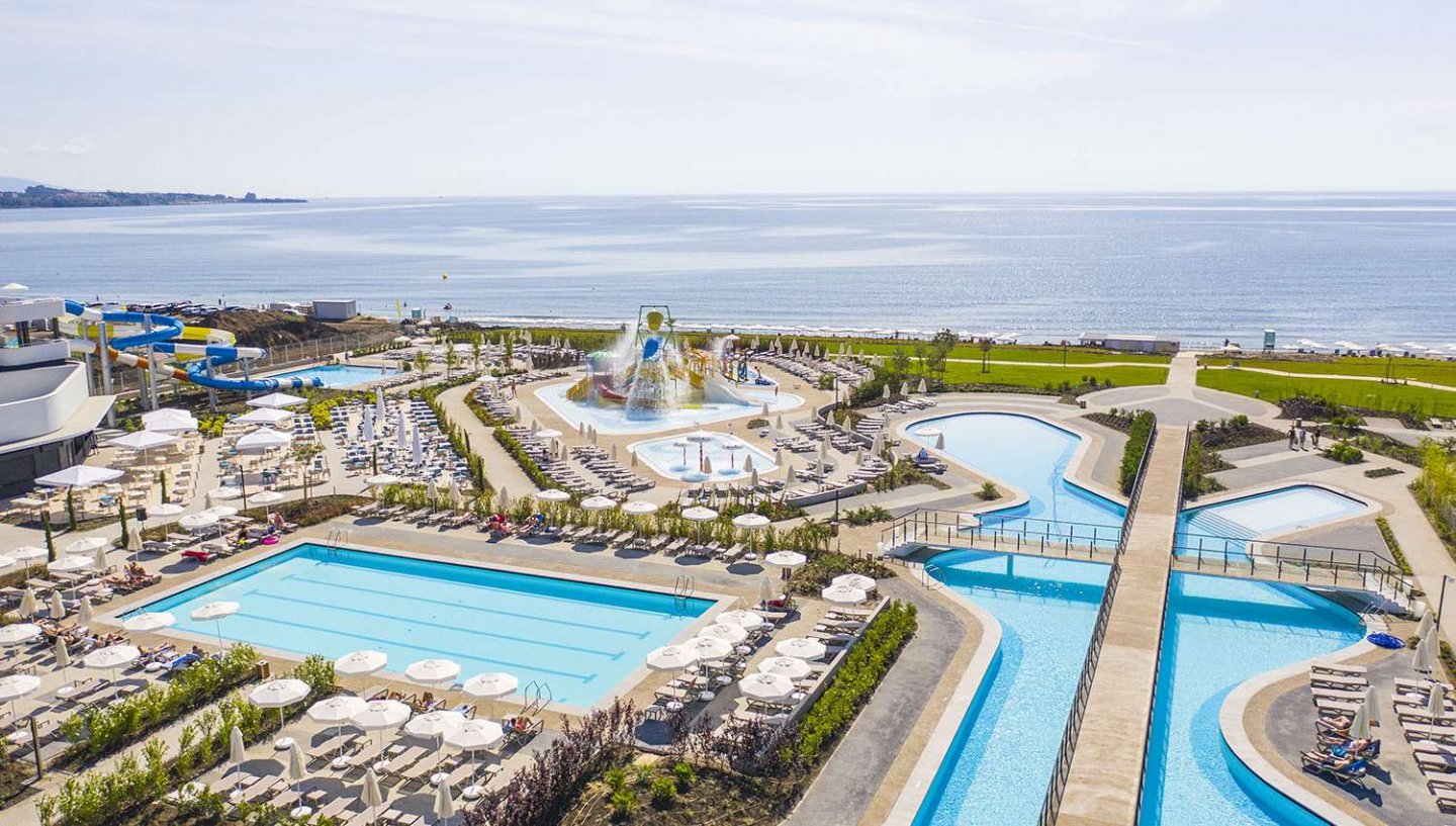 KirjeldusTegemist on luksusliku 5-tärni hotelliga, mis asub vaikses piirkonnas, kuurordi keskusest umbes 2,6km (Aheloy) ja 7,4km (Pomorie), otse tumeda liivaga ranna ääres. Paistab silma erakordselt kõrge tubade standardi poolest, pakub kvaliteetset Ultra All-Inclusive kontseptsiooni 24/7 toidu ja jookidega, keskenduvad tuntud rahvusvahelistele brändidele. Mitu basseini, veeliumäed, lastele mänguväljak, eraldi “Adults area”. Asukoha poolest pigem eraldatud, kuid ka ringi liikumiseks on piisavalt transpordi valikuid (nt buss, takso, autorent). Sobib täiskasvanutele rahulikuks puhkuseks. |