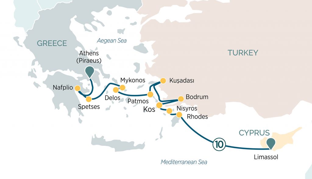 • Kruiisi marsruut: Limassol, Küpros – Rhodos, Kreeka – Nisyros (Kos), Kreeka – Bodrum, Türgi – Kusadasi, Türgi – Patmos, Kreeka – Delos – Mykonos – Spetses, Kreeka – Nafplio, Kreeka – Ateena (Piraeus), Kreeka
